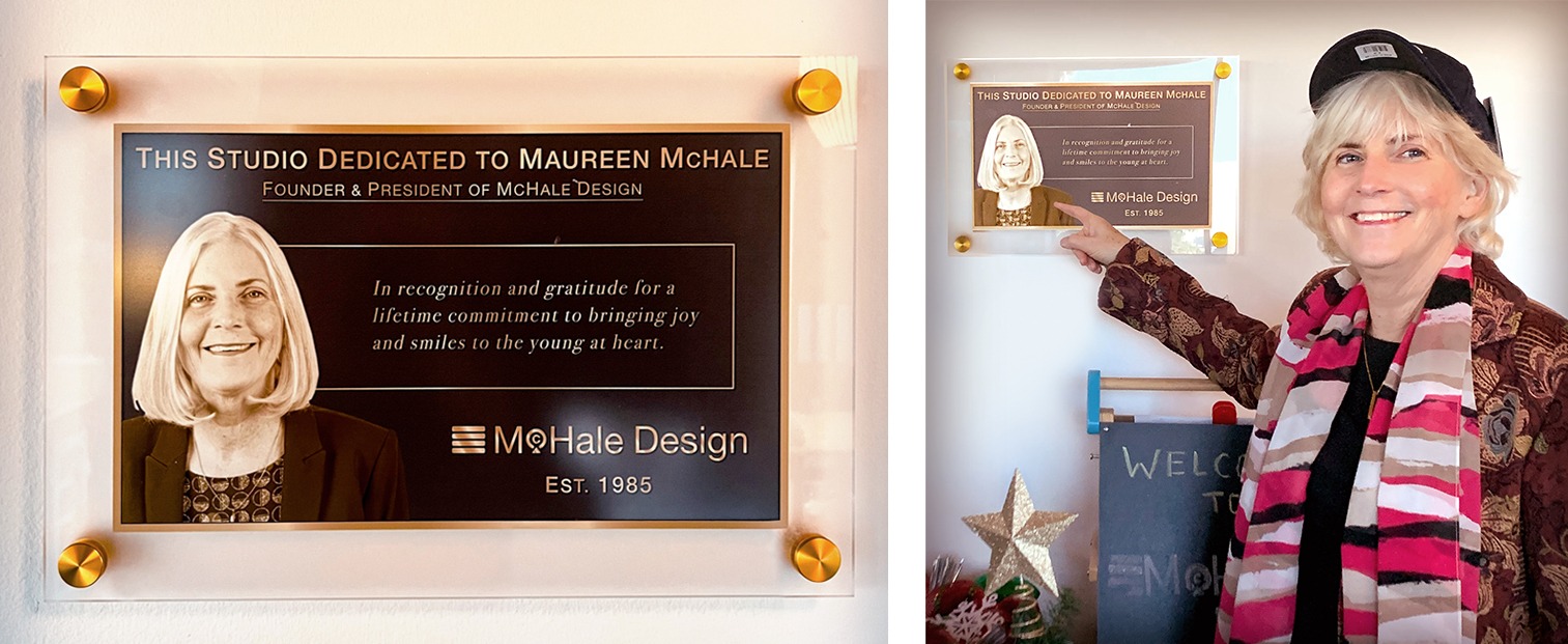 Hey friends! Maureen is off on new adventures! At the end of 2021, we threw a Holiday/Retirement party, surprising her with a plaque dedicating the McHale Design Studio to our fearless founder. Maureen had spent her entire career dedicated to bringing joy and smiles to the young at heart and we wanted her to rest assured this commitment would continue in her name.