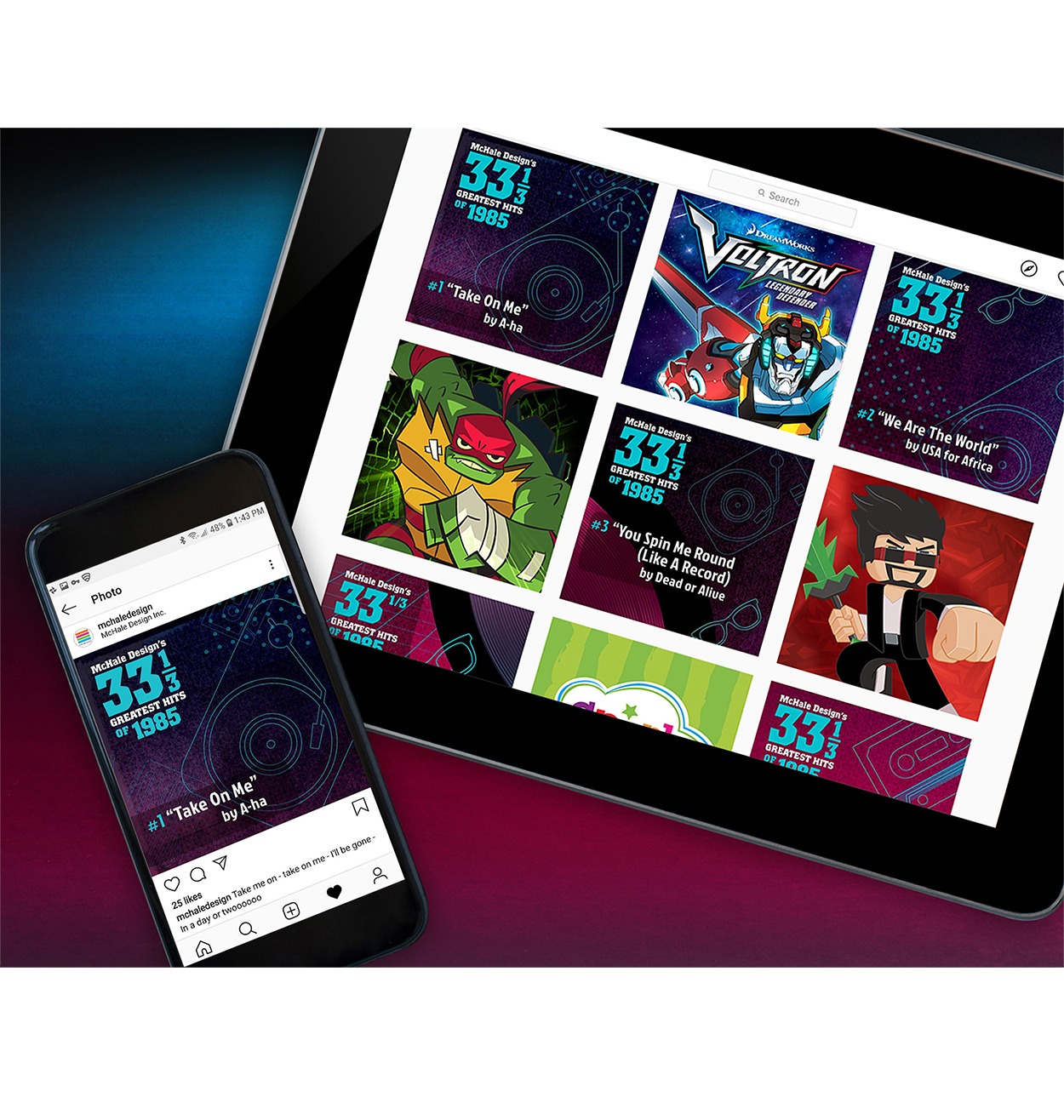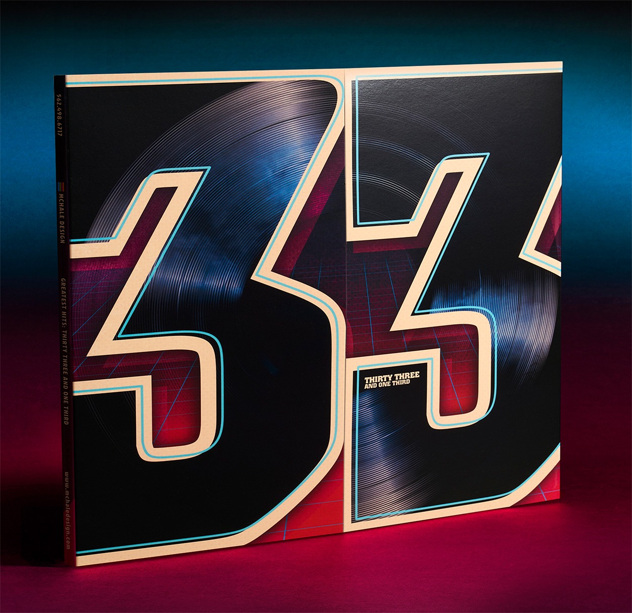 To celebrate our 33 1/3rd year anniversary, McHale Design conceived a self-promo campaign inspired by the music of 1985, the year we were born; 33 1/3rd Greatest Hits, a full-size gatefold record cover opening to an actual vinyl record which spins to reveal landmark dates in McHale Design’s history.